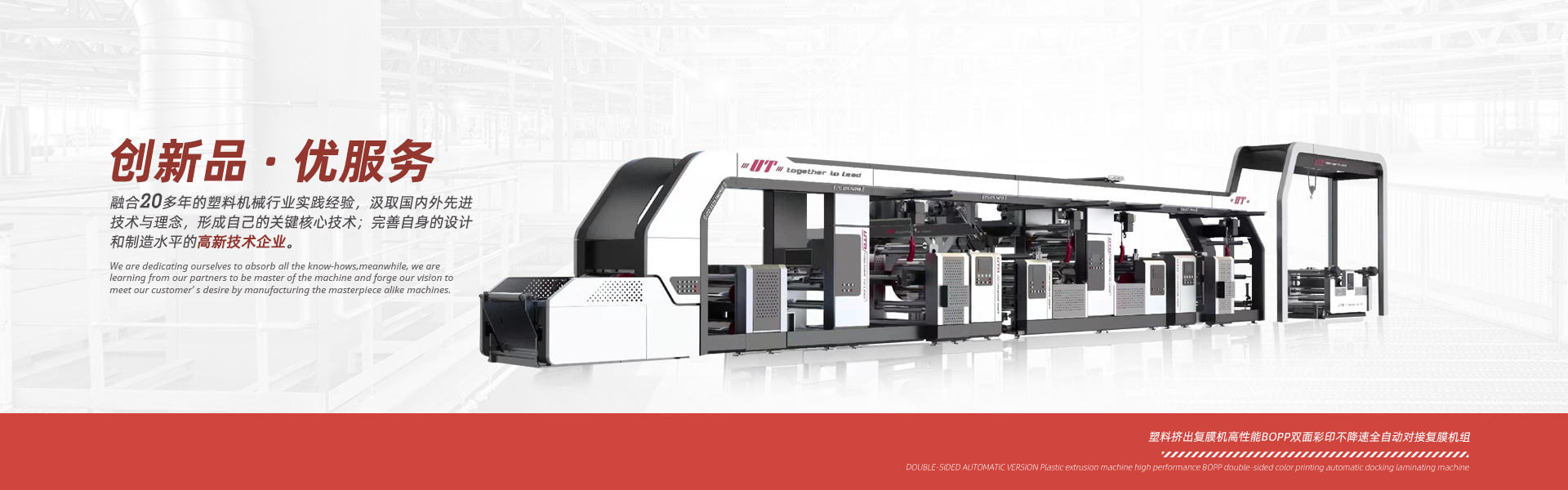 優(yōu)特機械精心致力于塑料編織行業(yè)、紙塑軟包裝行業(yè)、輪胎制造行業(yè)等成套生產(chǎn)設(shè)備的設(shè)計和制造,并為用戶提供生產(chǎn)工藝及培訓。我們的服務范圍包括各類塑料覆膜機、紙張覆膜機、BOPP彩印膜雙面自動對版覆膜機、 紙塑邊縫三合一覆膜機、中縫印刷制袋機、以及輪胎行業(yè)循環(huán)回收使用的隔離膜生產(chǎn)線。